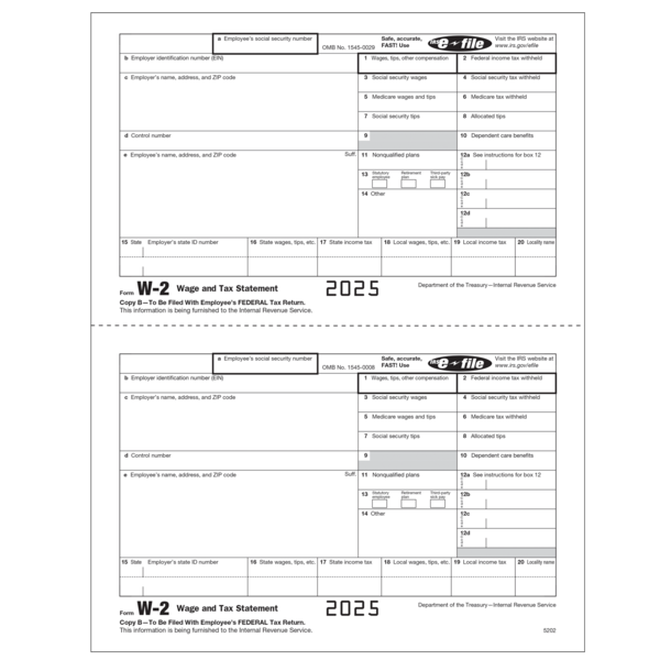 520225 W-2 Employee Copy B 25 Pack SKU: 520225 $18.96 Prior Job# Special Instructions Logo & Options : $0 - Color Logo $68 - Black Logo $90 - Color Logo No Charge - 1 Color Logo No Charge - Black Logo Quantity -+ Please select options before adding to cart Add to Cart Add to Cart